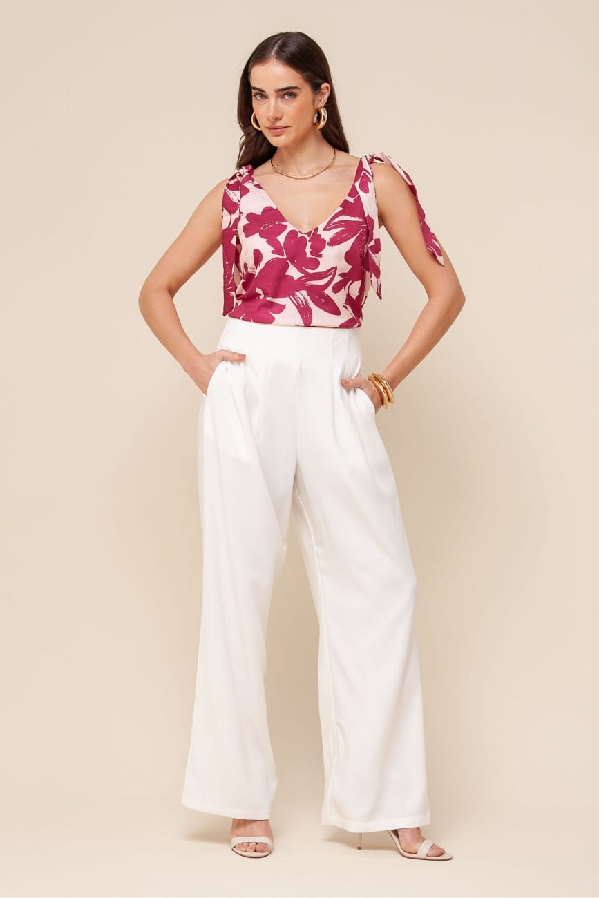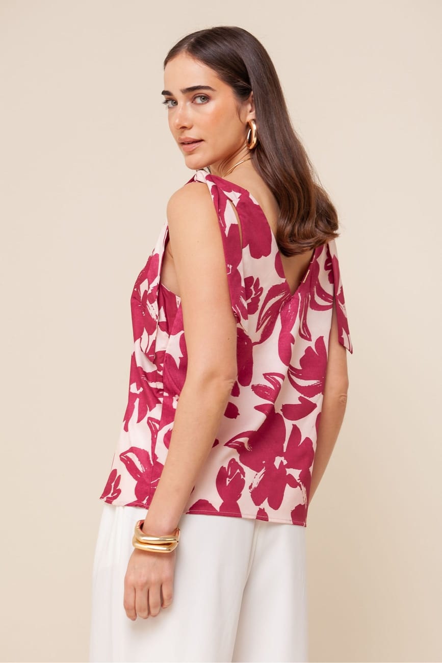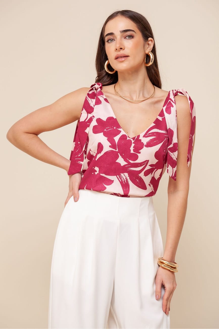 Blusa floral vermelha com decote V e alças com amarração. Modelagem fluida e leve, perfeita para looks sofisticados e frescos.
