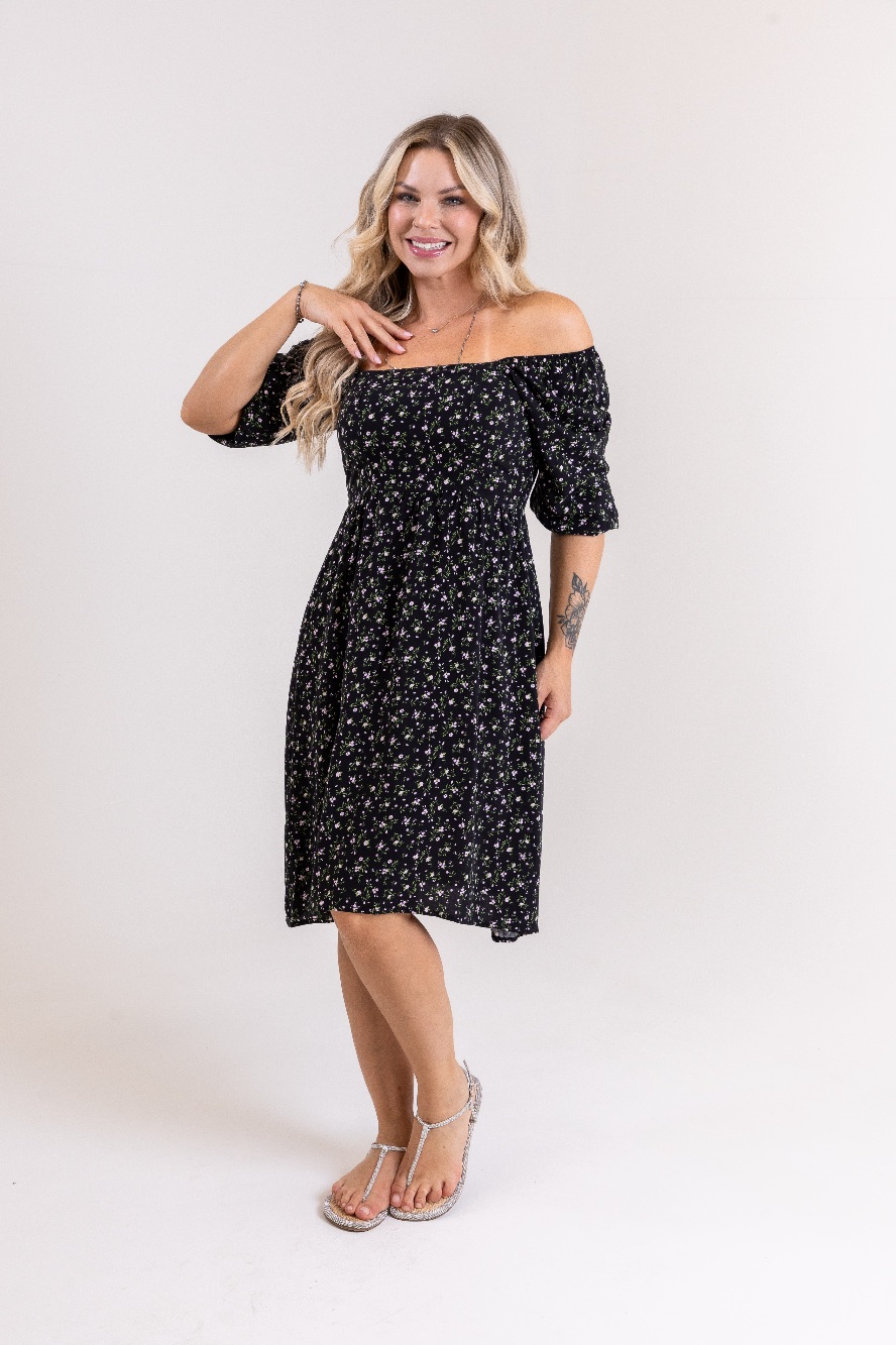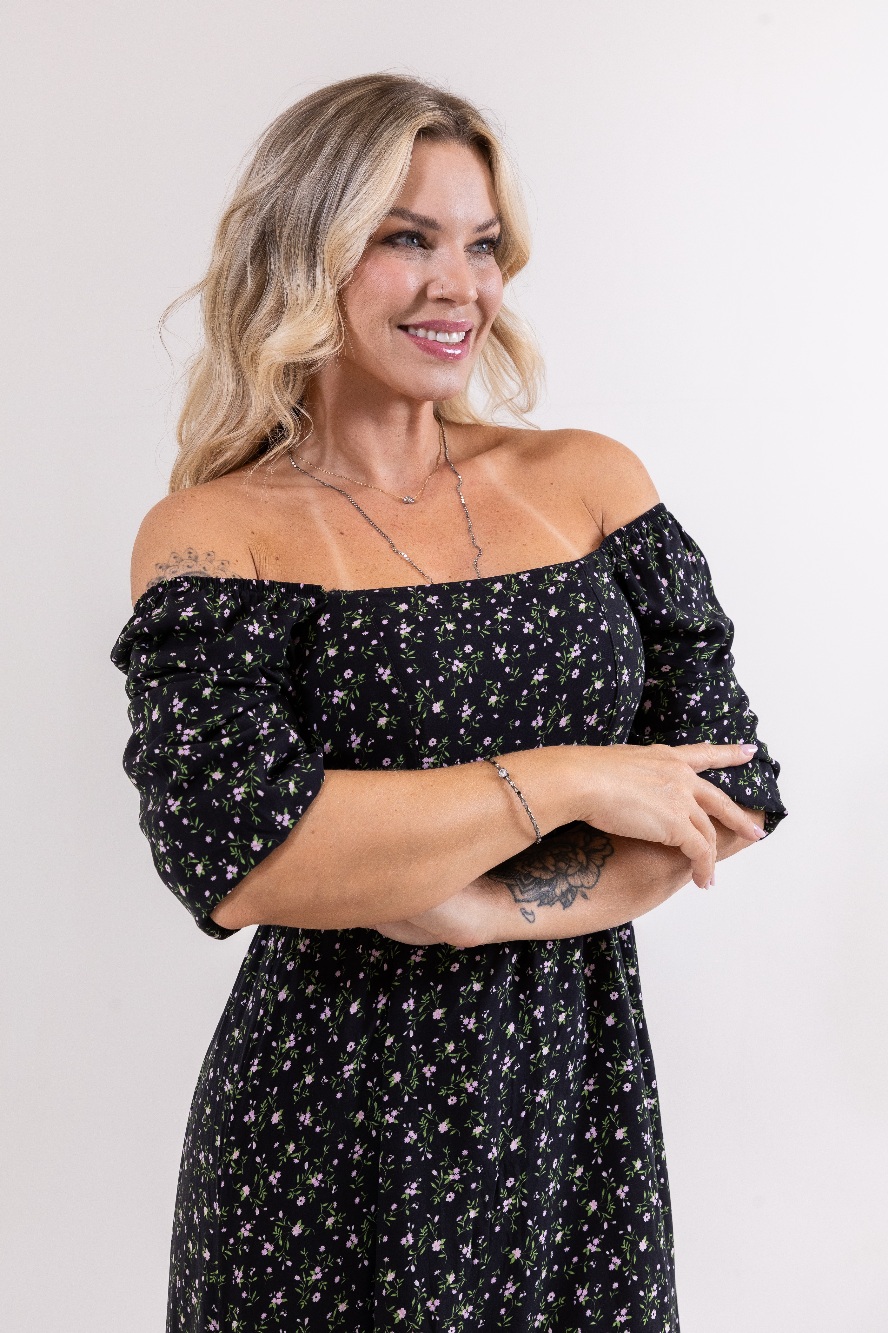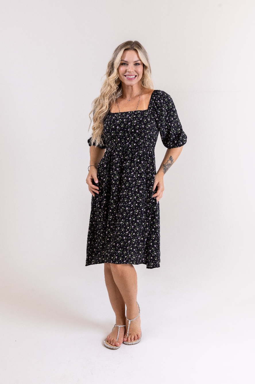 Vestido em viscose com estampa floral, modelagem fluida e confortável. Perfeito para um visual delicado e feminino, combinando estilo e frescor.