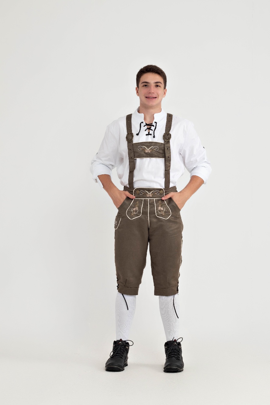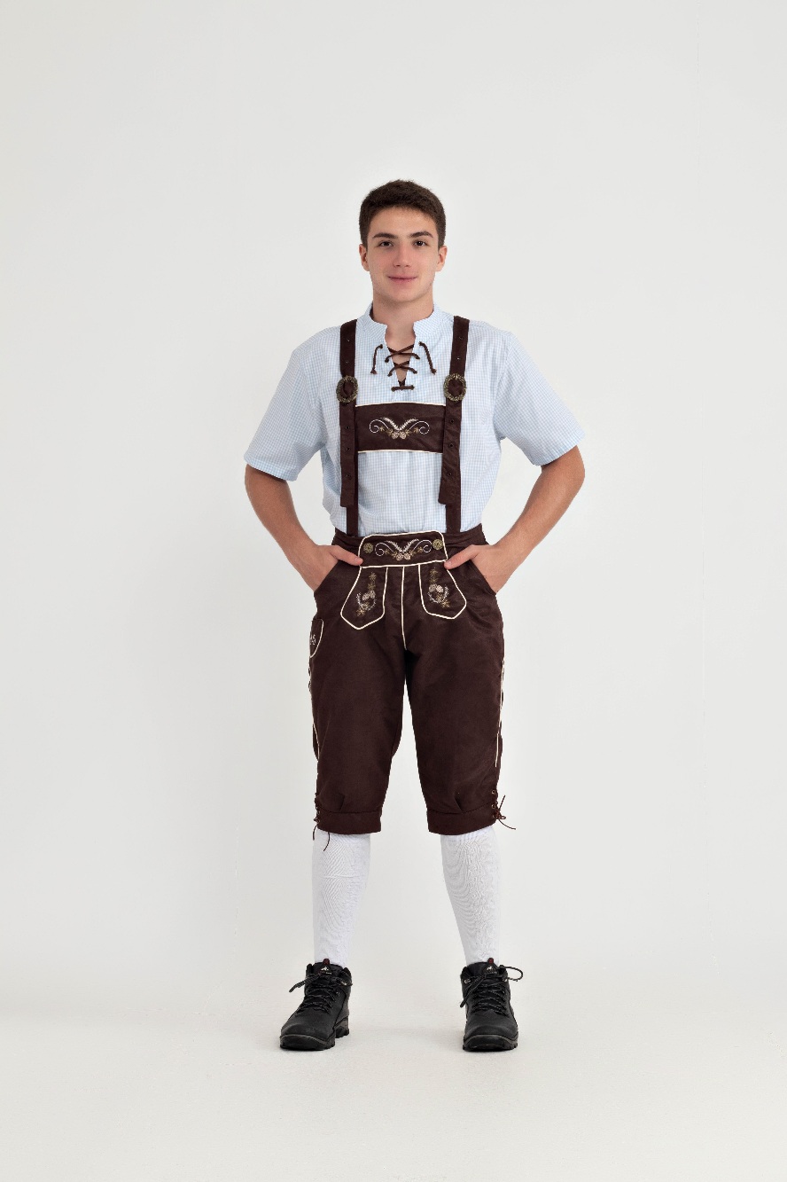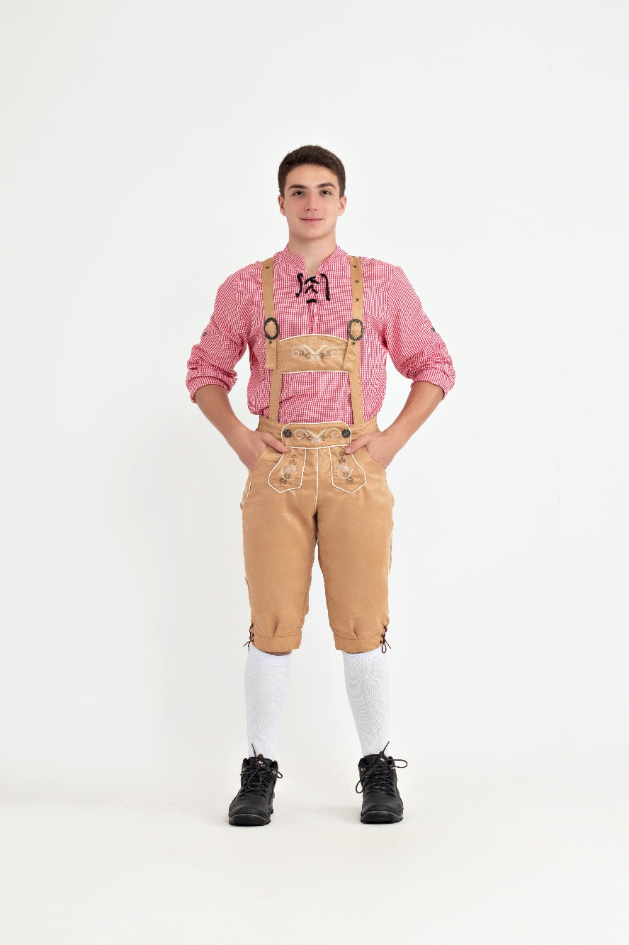 A Jardineira Camurça é uma releitura autêntica da tradicional Bermuda Lederhosen, típica da cultura alemã. Confeccionada em camurça de alta qualidade, conta com suspensório removível que agrega versatilidade ao traje.