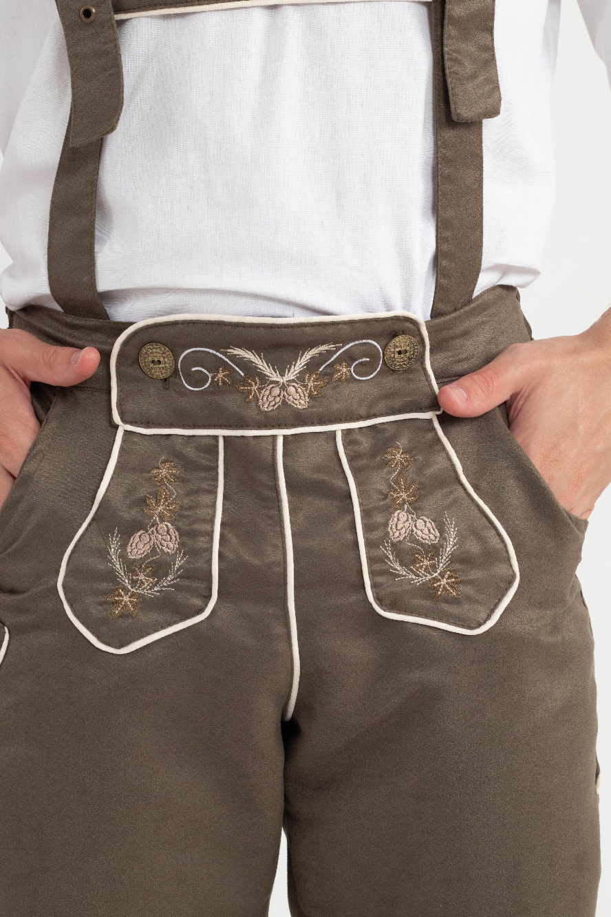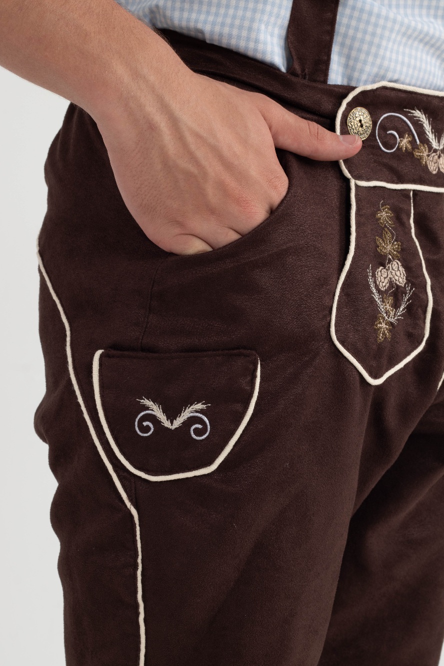 Bermuda Lederhosen típica alemã com suspensório removível, bolsos e bordado.
